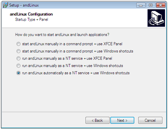 Por defecto andLinux viene con XFCE como entorno de Escritorio, aunque hay una versión con KDE incorporado. Además consta de un terminal, un explorador de ficheros y Synaptic, que facilita y automatiza la instalación de programas bajándolos de Internet.